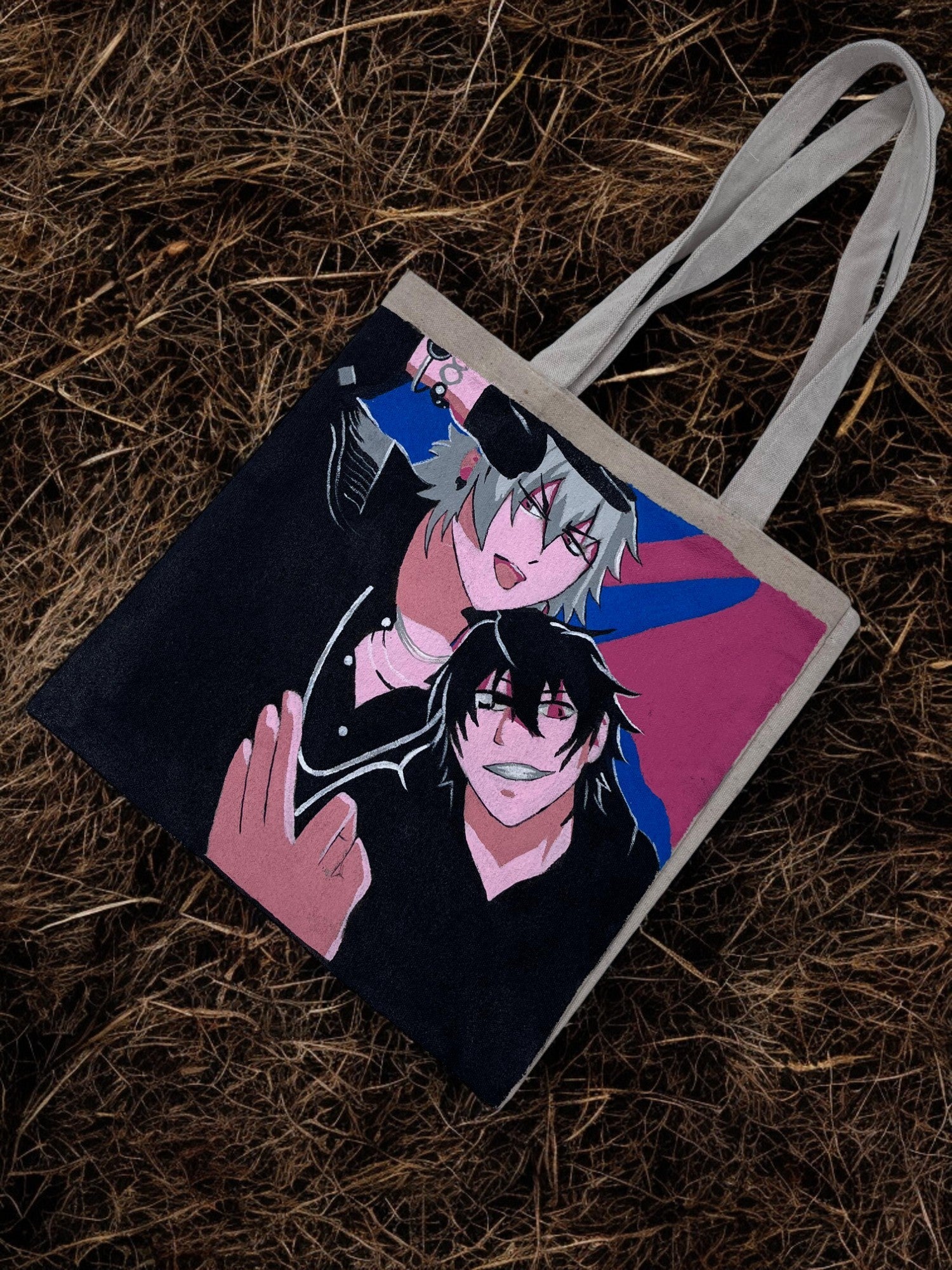 Carry your favorite duo with our Hand-Painted Anime Characters Tote Bag!