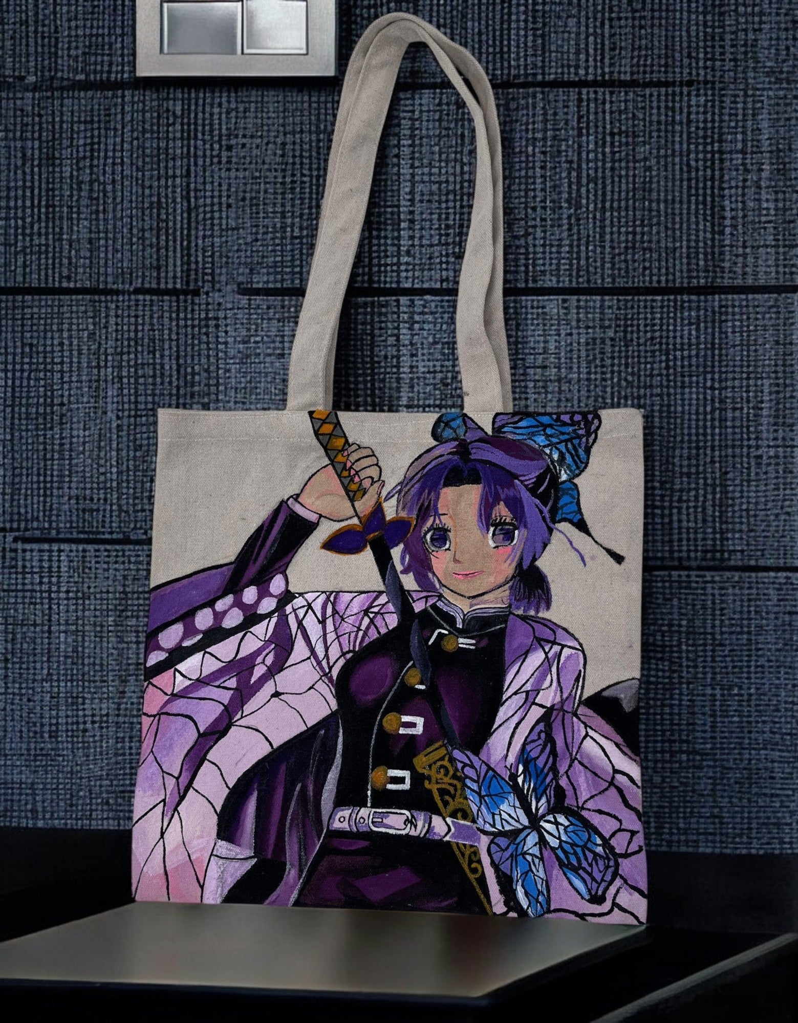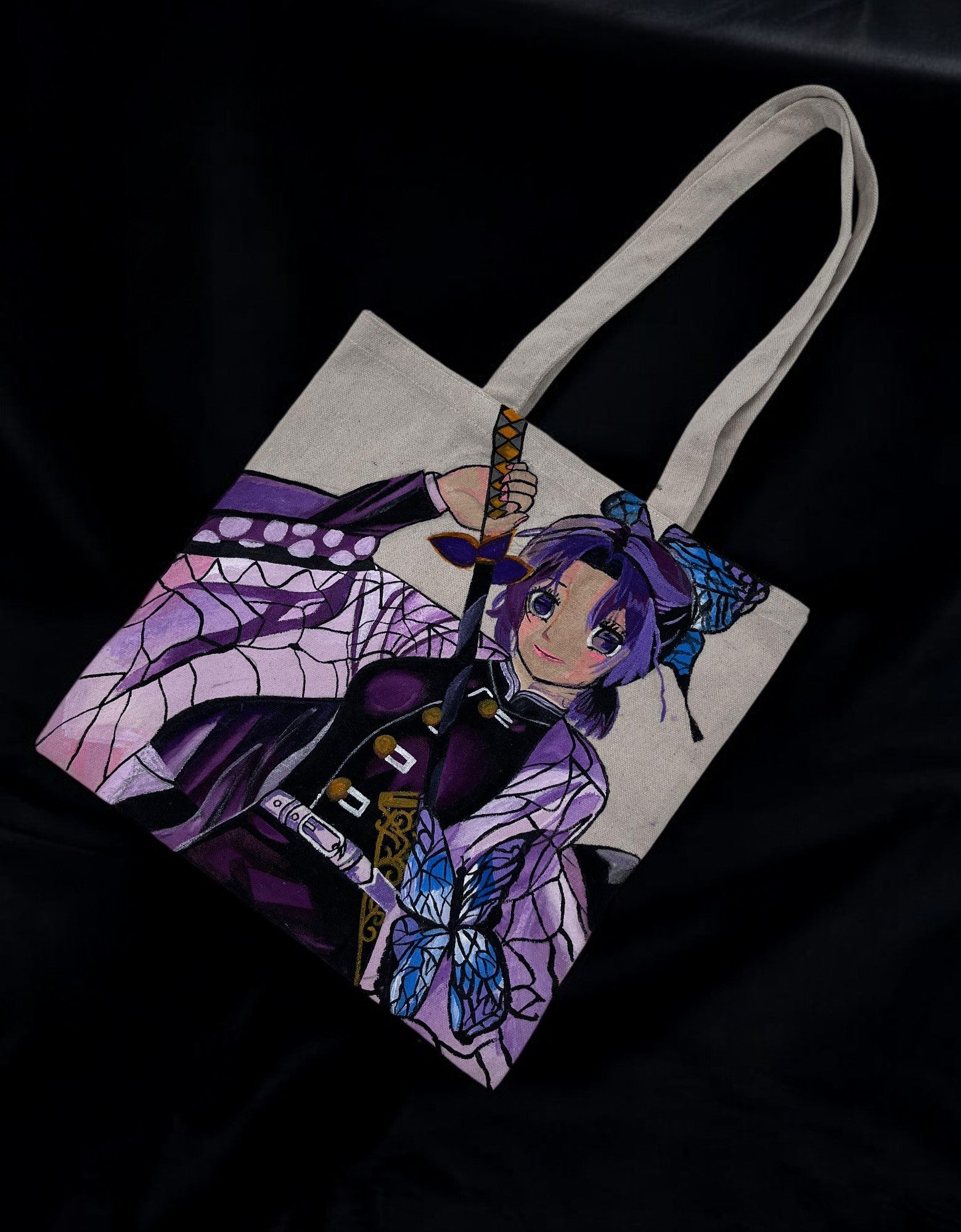 The highlight of this tote bag is its detailed, hand-painted illustration of a popular anime character, who appears to be Shinobu Kocho from Demon Slayer. The artwork captures her distinctive purple and black outfit, butterfly-themed hair accessories, and sword. The hand-painted nature of the design makes each bag a unique piece of fan art.