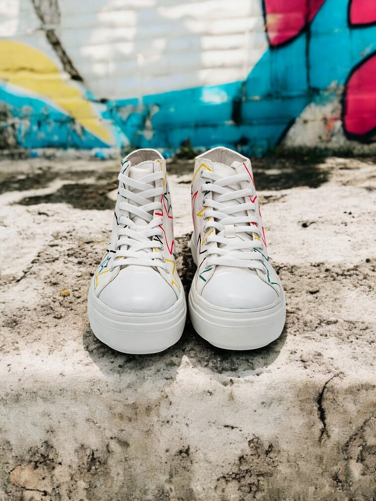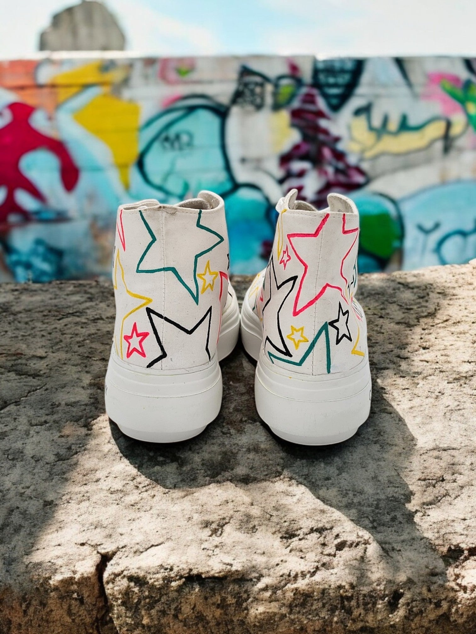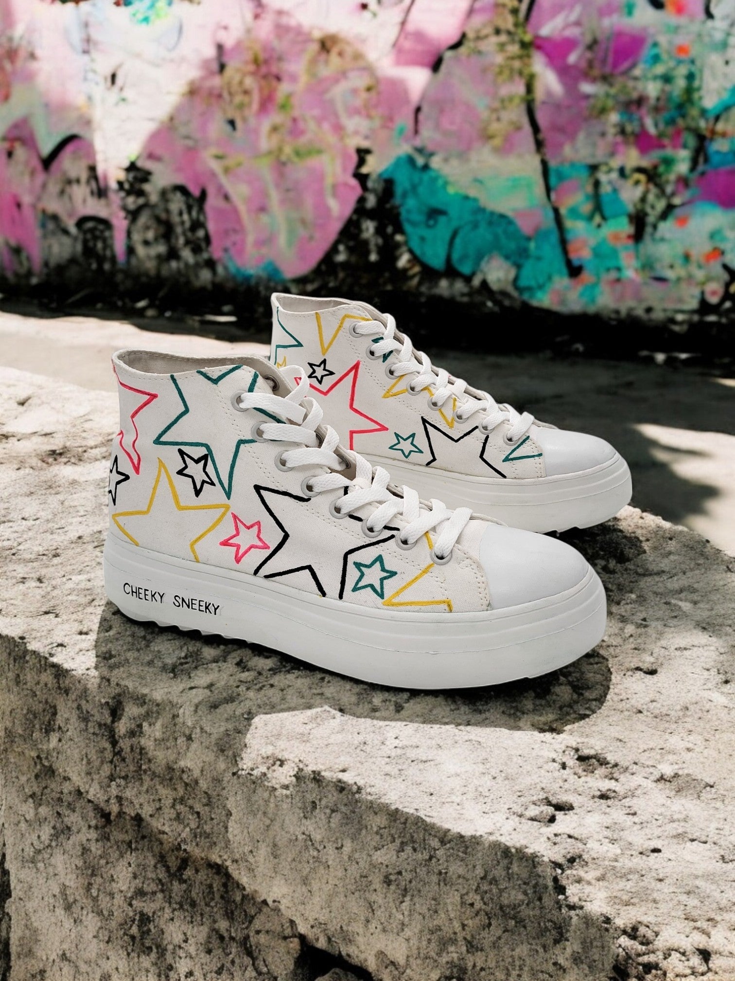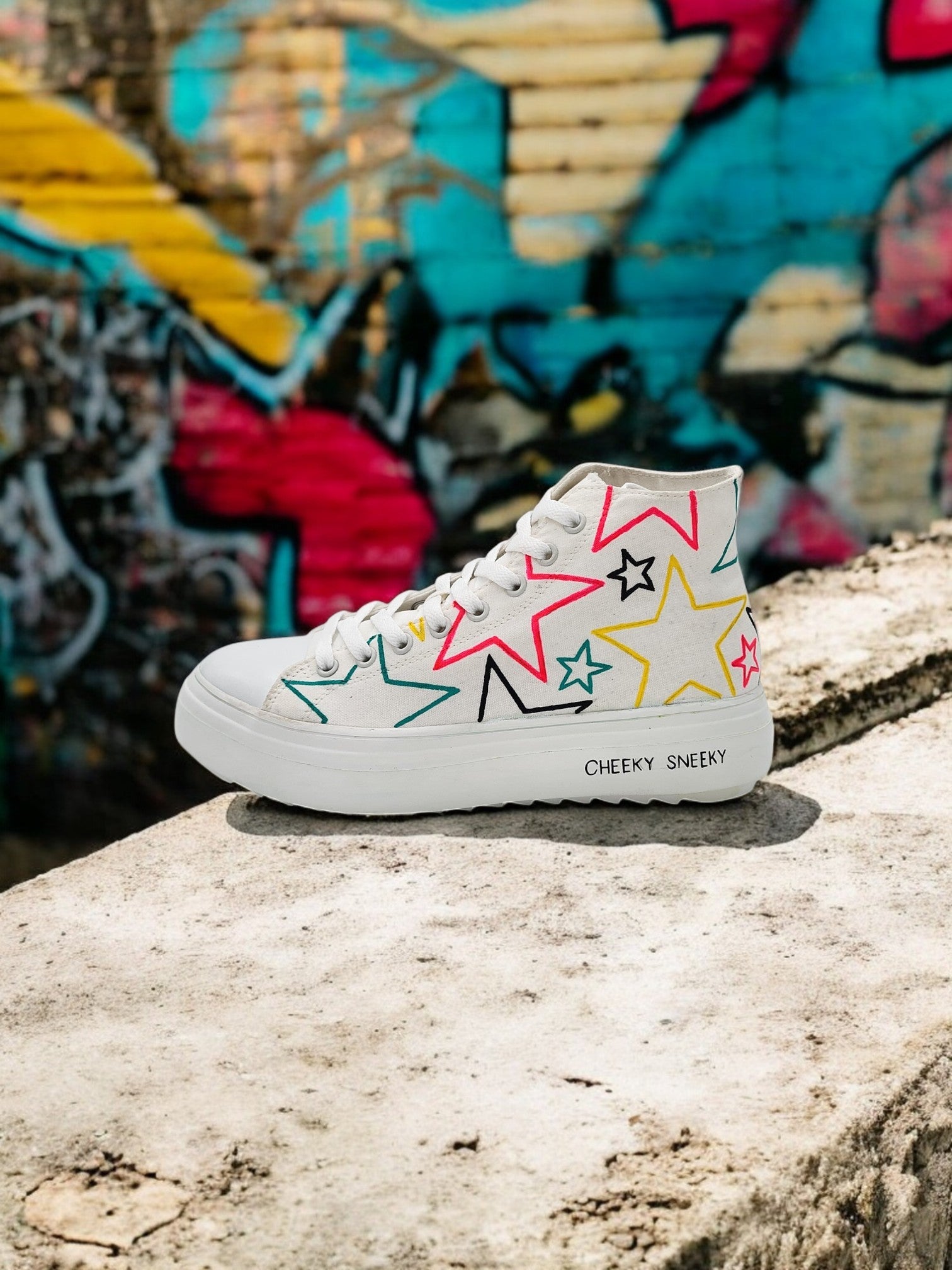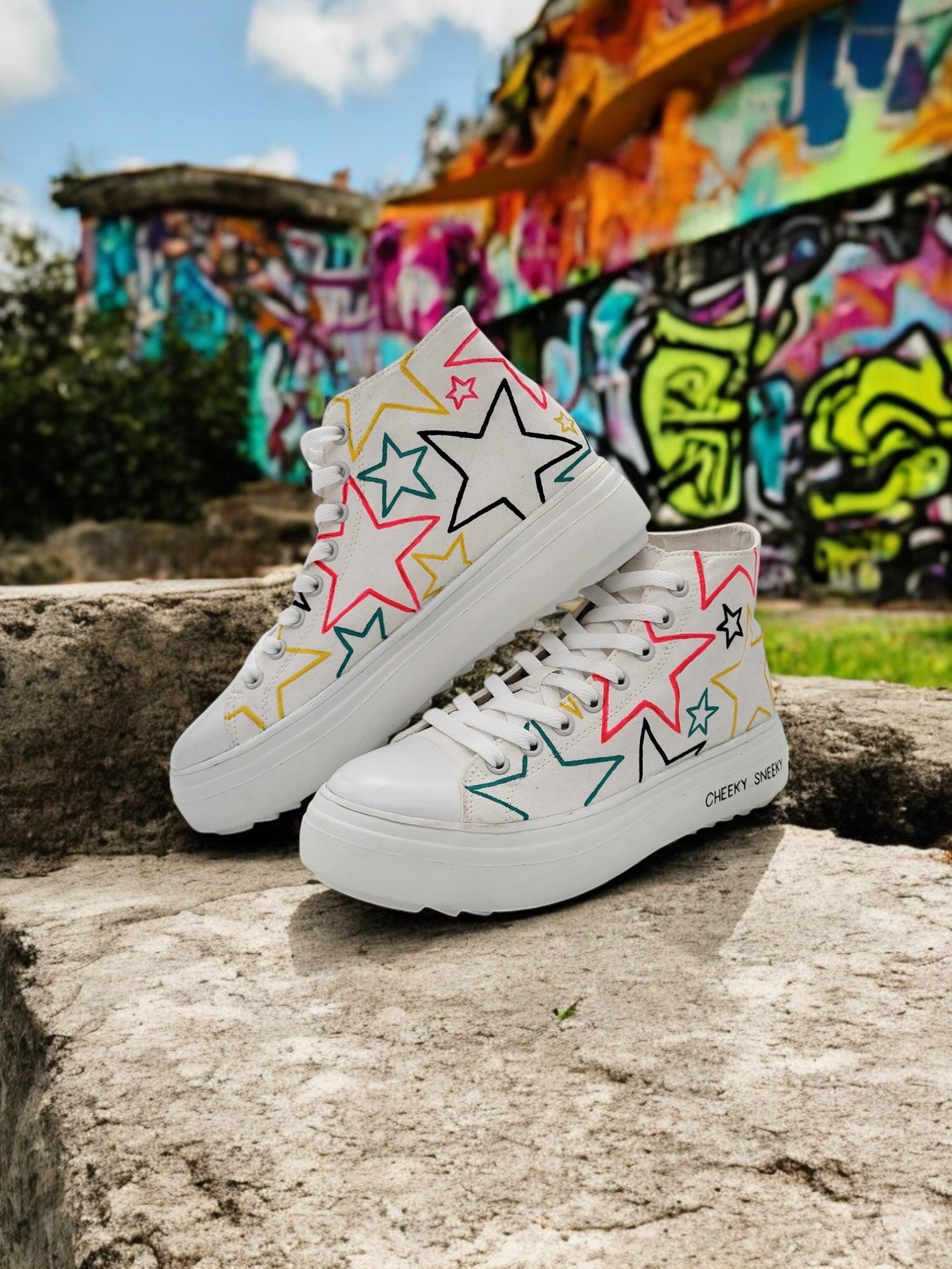 Embark on a style journey that's out of this world with these Galaxy Trek high-top sneakers! Featuring a vibrant and dynamic design of multi-colored star outlines scattered across a clean white canvas, these shoes bring a touch of cosmic energy to your every step. The subtle "Cheeky Sneeky" detail adds a playful and unique element.