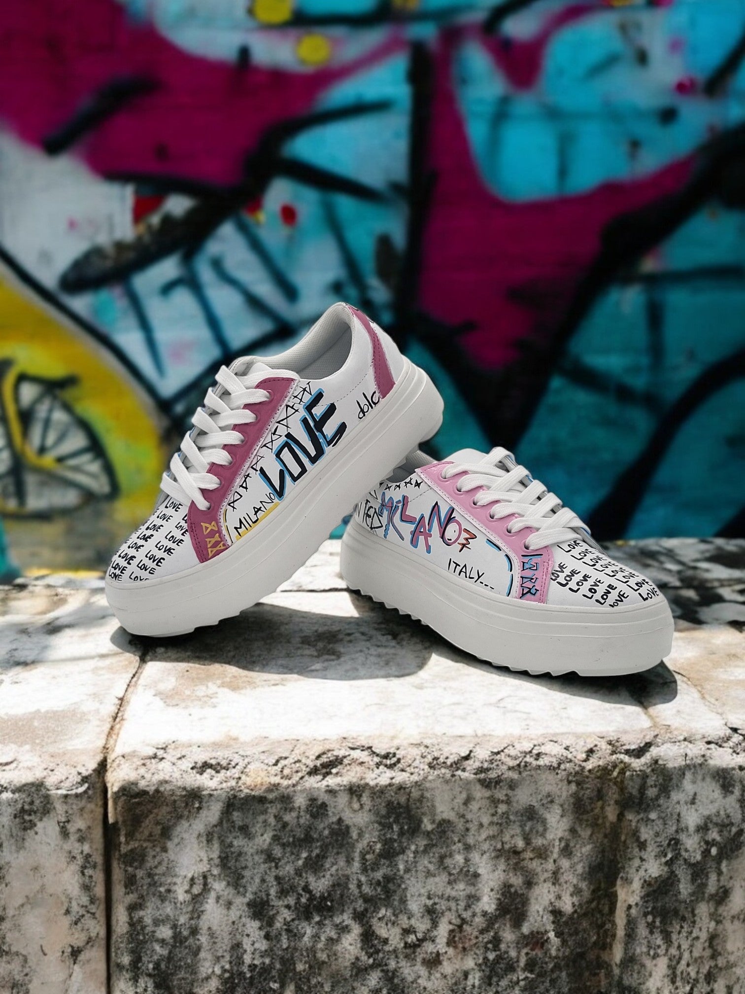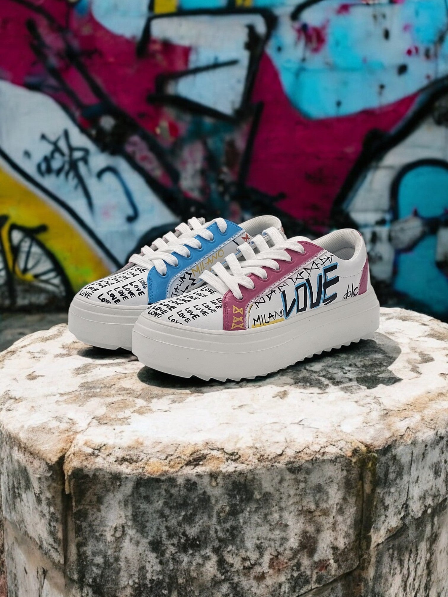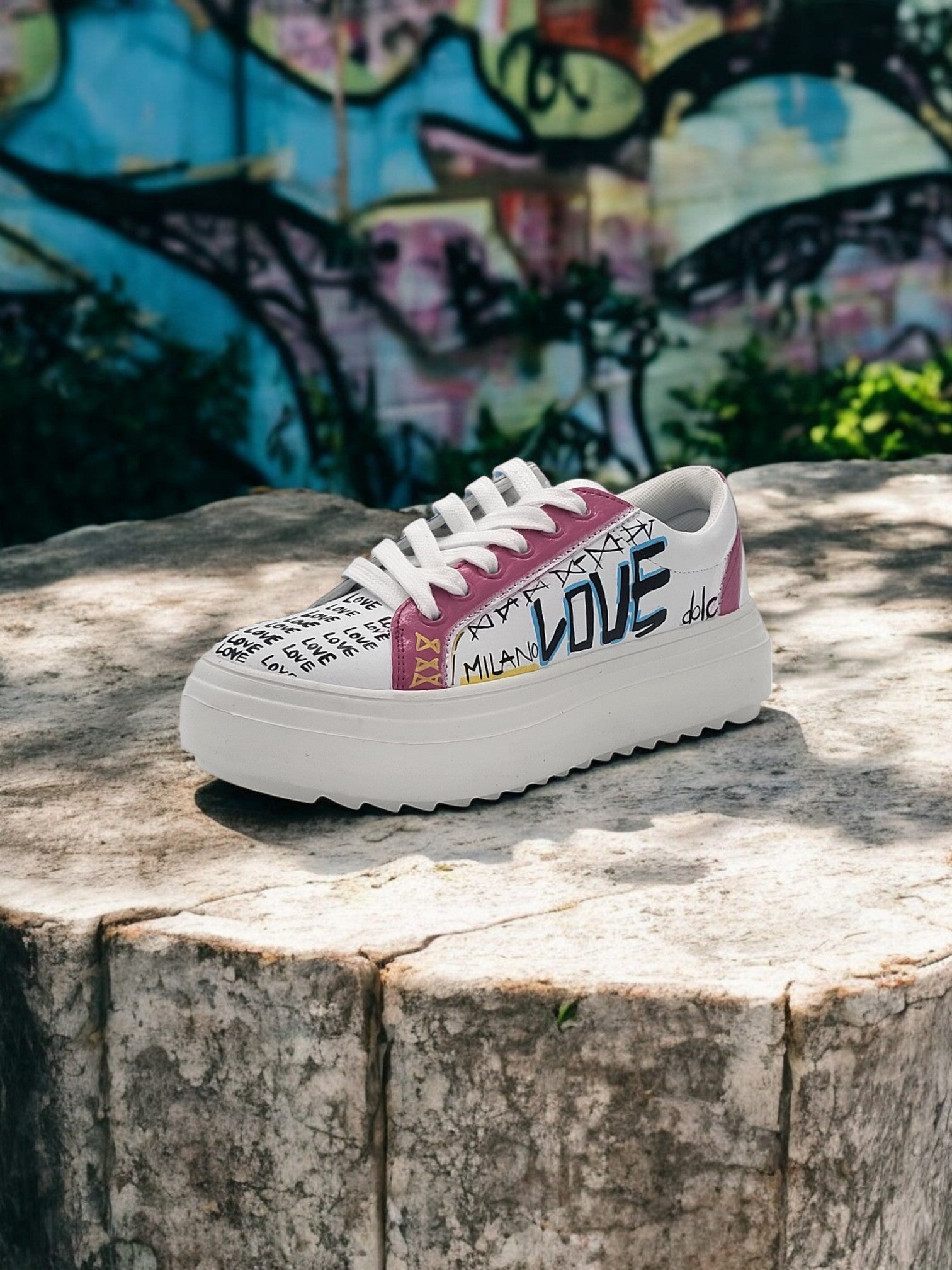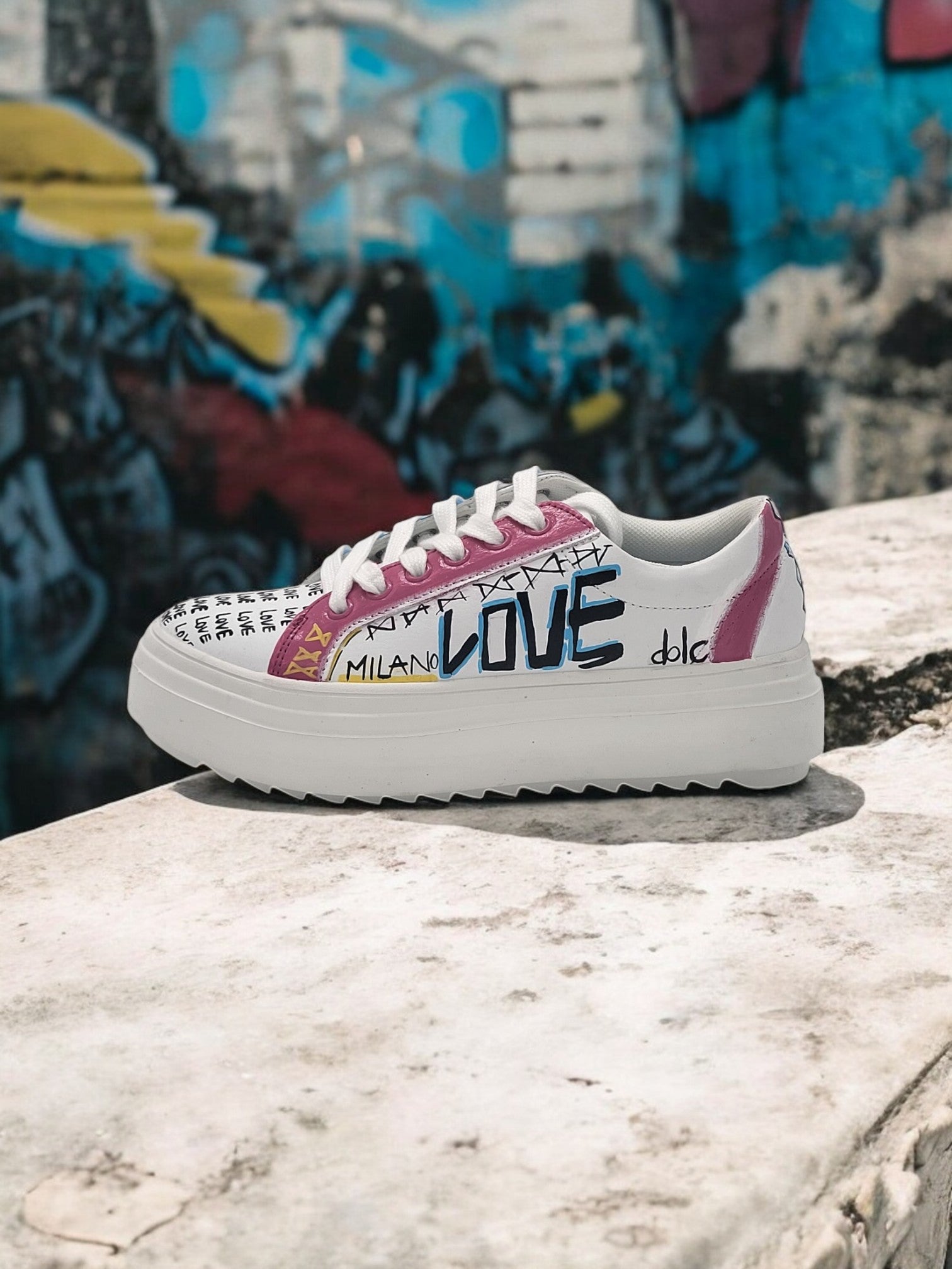 Wear your heart on your feet with these expressive Love Doodling sneakers! Featuring a clean white base adorned with playful graffiti-style words like "LOVE", "dolc", "MILANO", "ENGLAND", "ITALY" and more, these shoes are a wearable canvas for your unique style.