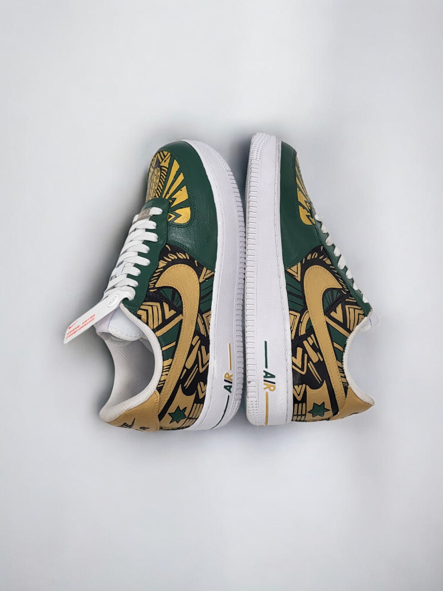 Elevate your sneaker collection with these custom hand-painted Air Force 1 sneakers, designed with an intricate tribal pattern that fuses heritage, art, and street style. These one-of-a-kind sneakers showcase bold, geometric tribal motifs, making them a statement piece for any sneaker enthusiast.