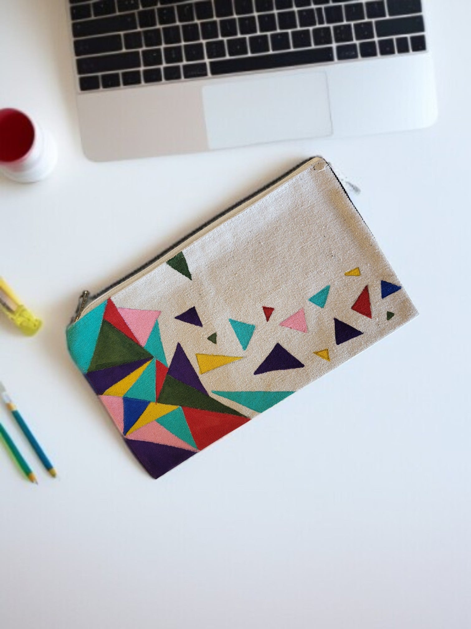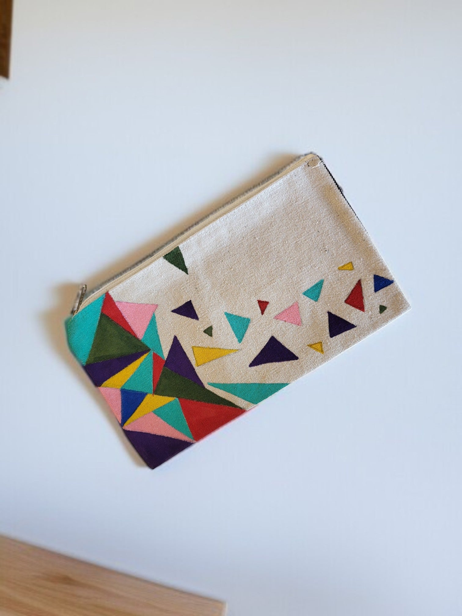 The highlight of this pouch is its eye-catching design of hand-painted geometric shapes. Triangles in various sizes and colors – including red, blue, green, yellow, and pink – create a dynamic and artistic pattern. The hand-painted nature of the design means that slight variations may occur, making each pouch a truly unique piece.