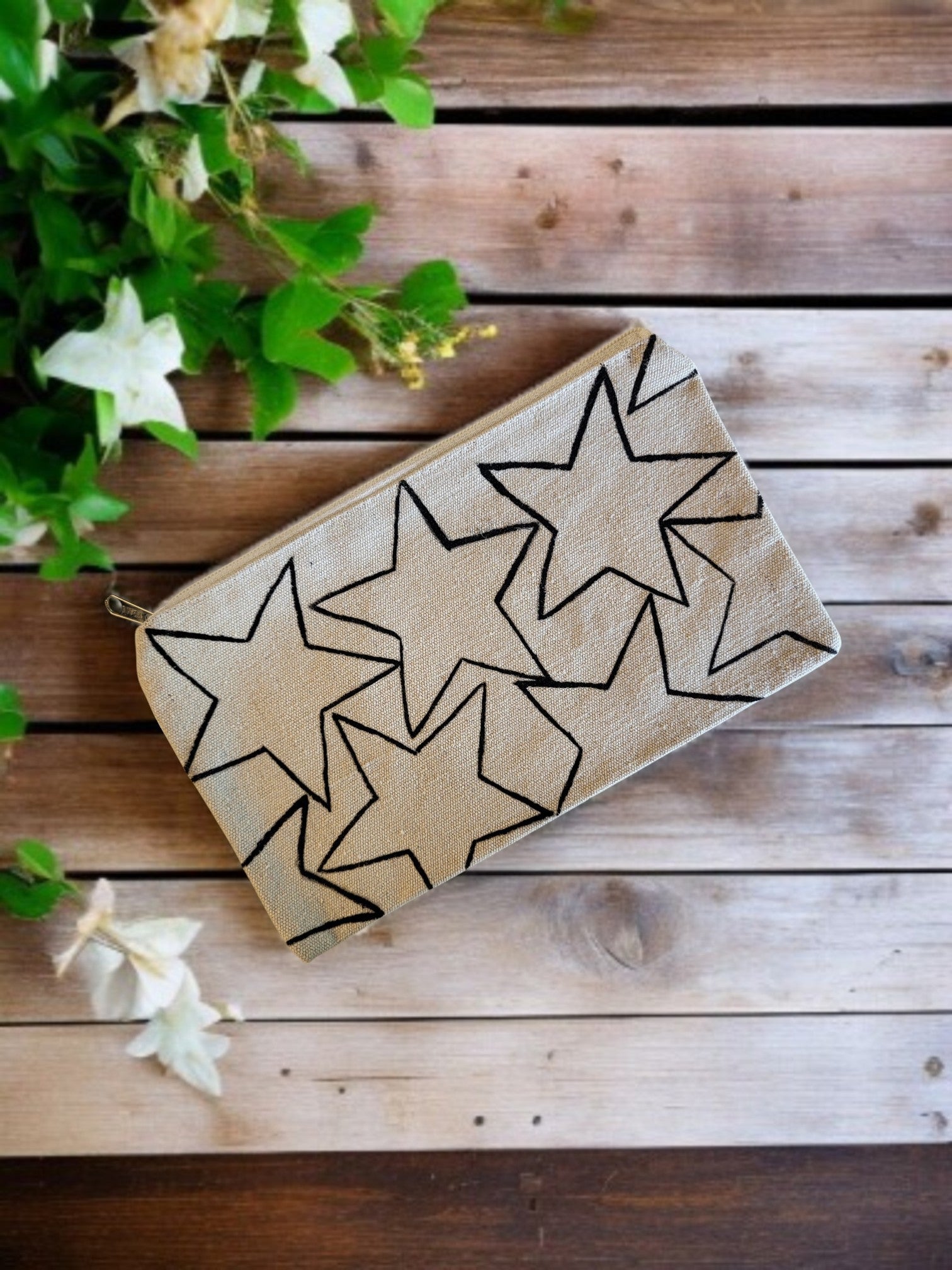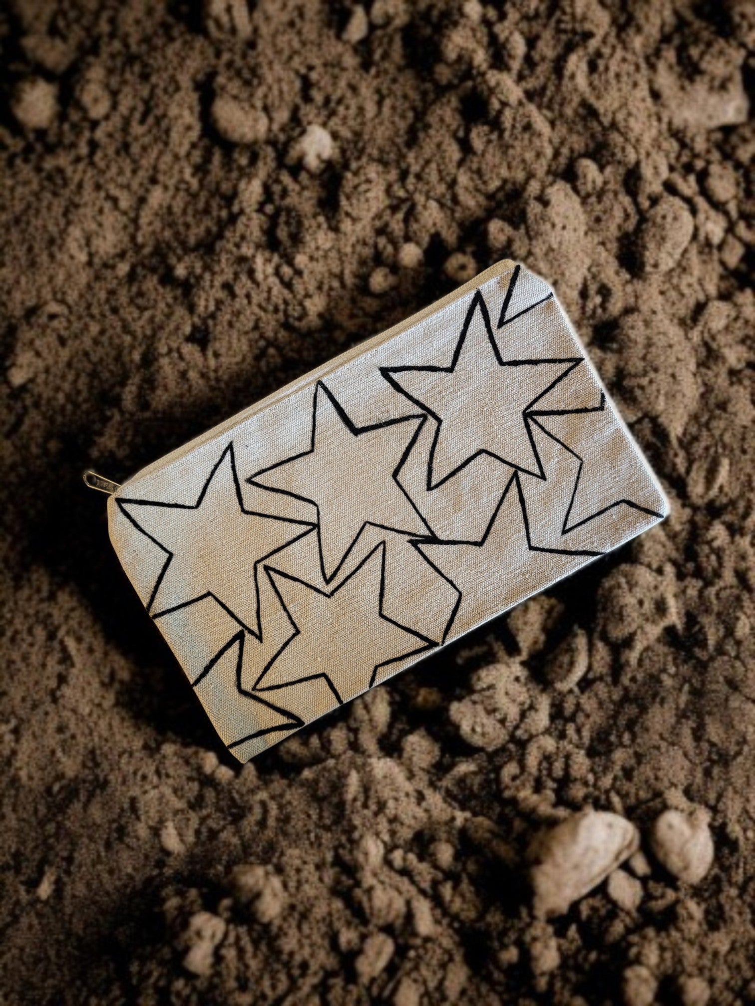 The design features hand-painted black outlines of stars scattered across the pouch. This minimalist yet eye-catching design offers a contemporary and slightly edgy aesthetic. The hand-painted nature of the design means that slight variations may occur, making each pouch a truly unique piece.