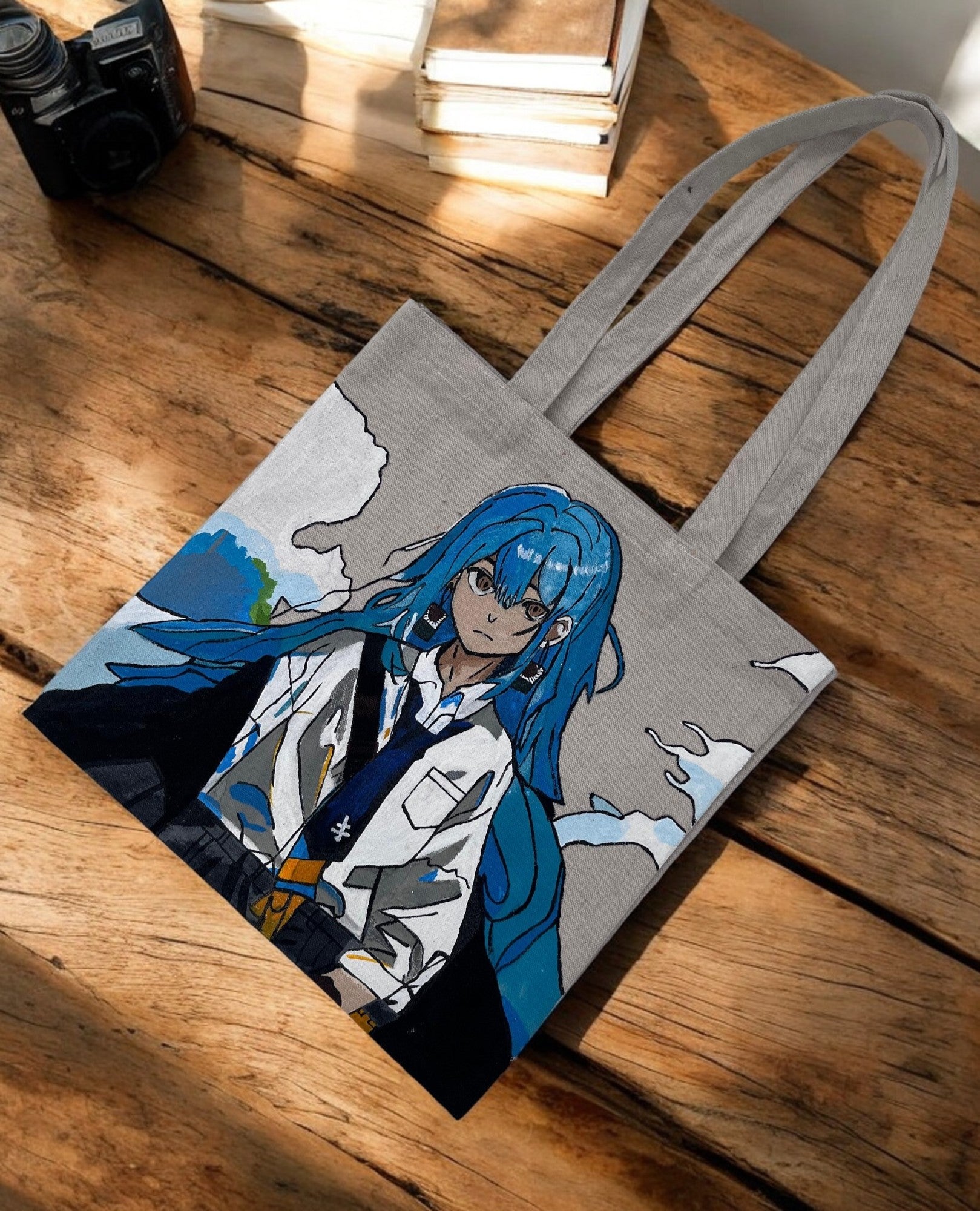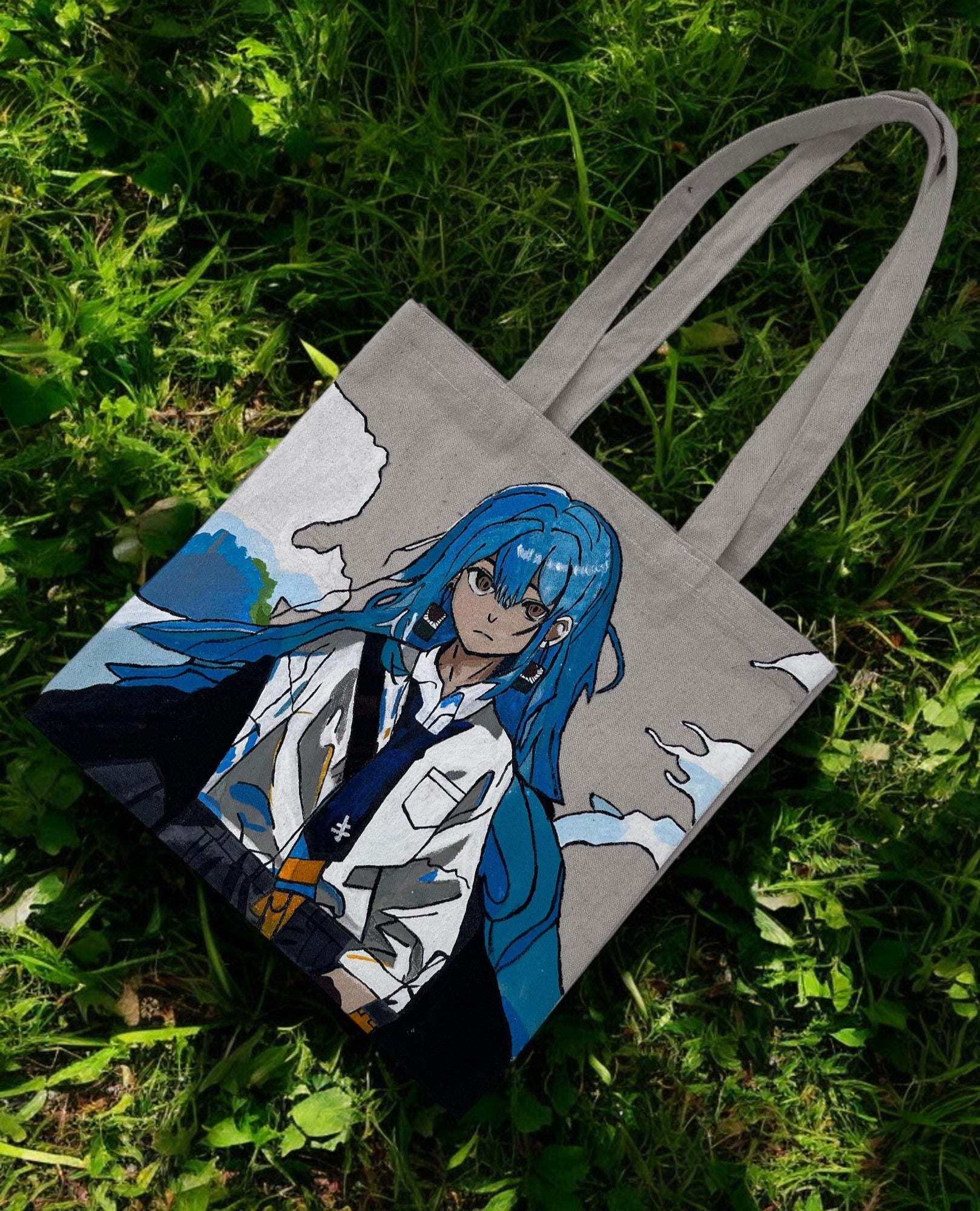 The highlight of this tote bag is the detailed, hand-painted illustration of a captivating anime character with flowing blue hair and striking eyes. The artwork features the character in what appears to be a detailed outfit against a stylized background. The hand-painted nature ensures that each bag is a unique piece of art.