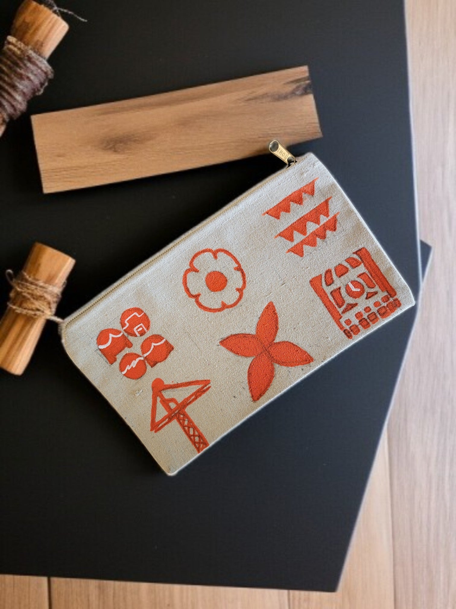 The design features a series of hand-painted geometric shapes in a vibrant orange hue. These shapes include abstract symbols and patterns, giving the pouch a bold and artistic look. Due to the hand-painted nature of the design, slight variations may occur, making each pouch a truly one-of-a-kind piece.