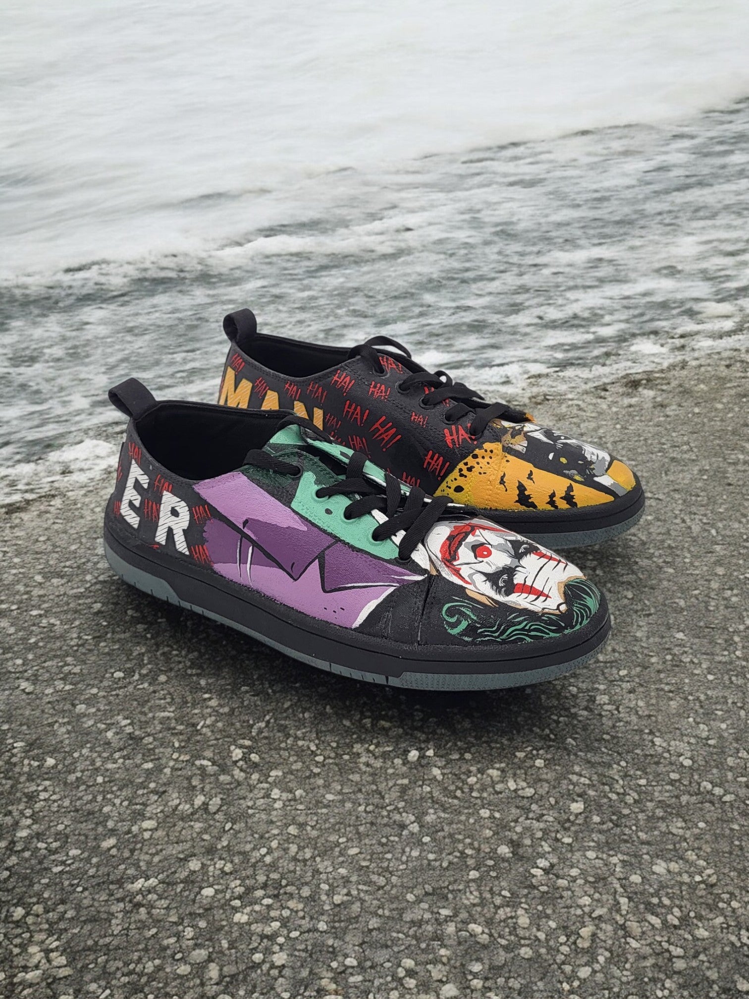 Hand-Painted Artwork – Featuring detailed portraits of Batman and The Joker, these sneakers capture their intense conflict with bold, dynamic brushwork.