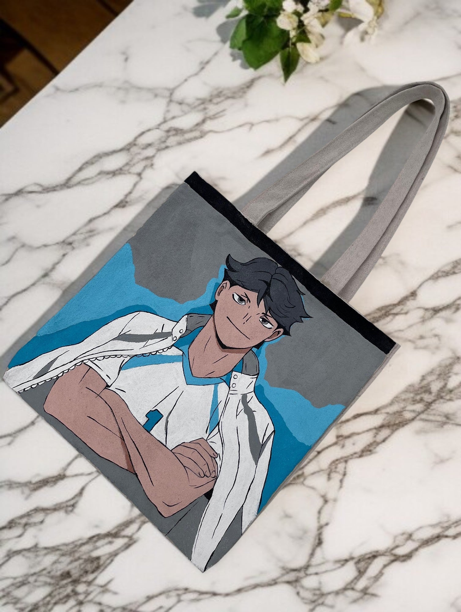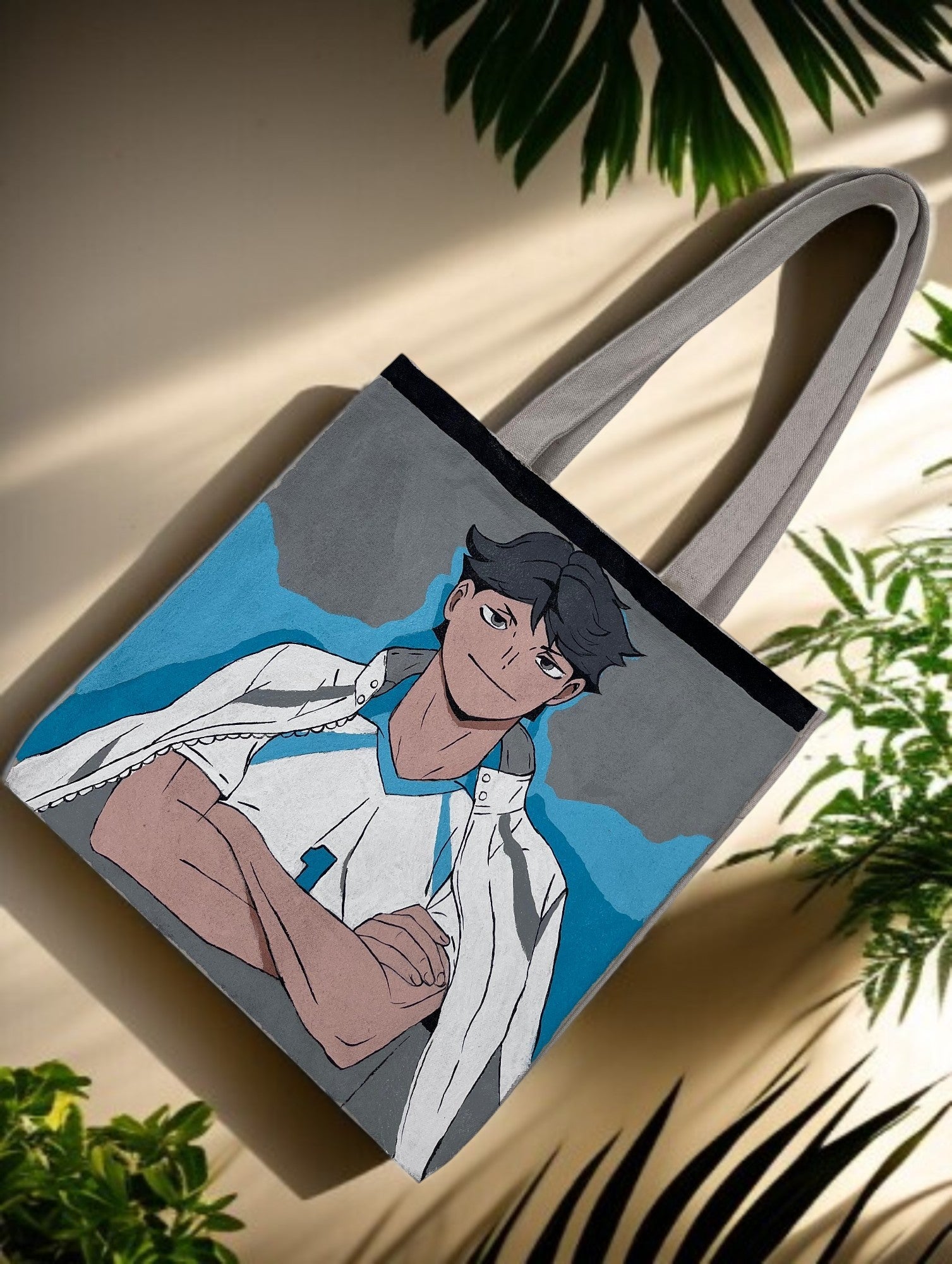 The highlight of this tote bag is the detailed, hand-painted illustration of what looks like Toru Oikawa from the anime Haikyuu!!. The artwork captures his characteristic smirk, spiky dark hair, and Aoba Johsai volleyball uniform with the number '1'. The hand-painted nature ensures that each bag is a unique piece of fan art.
