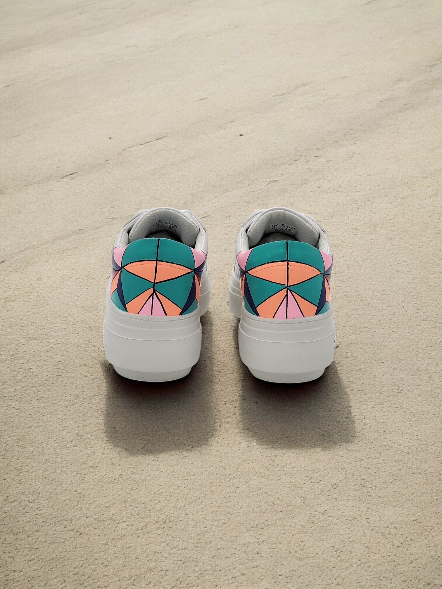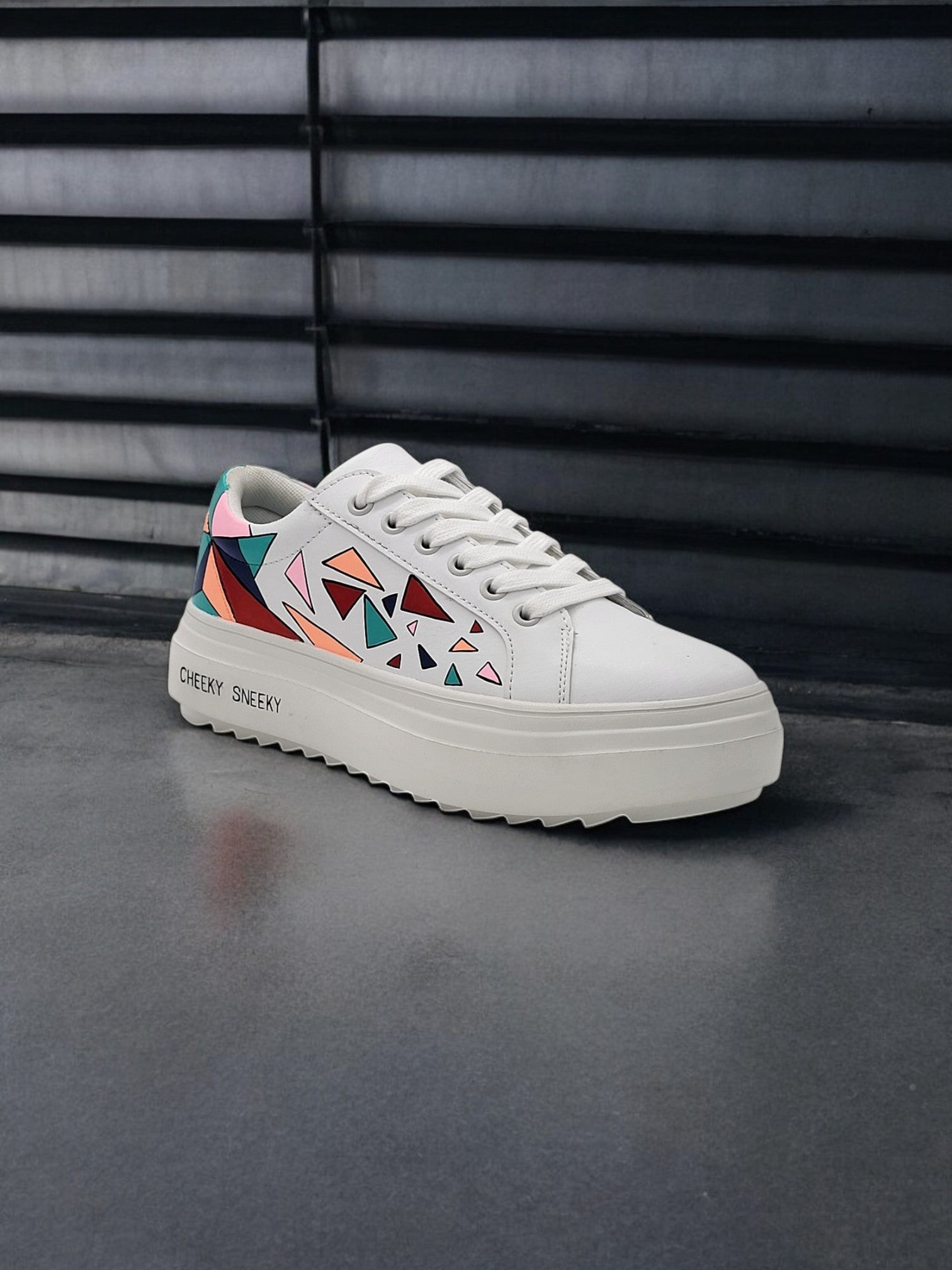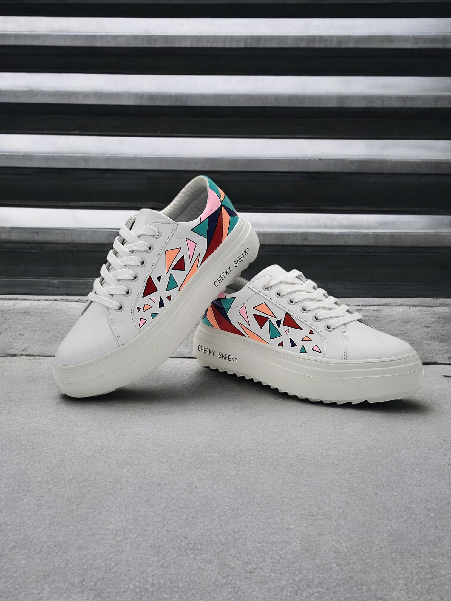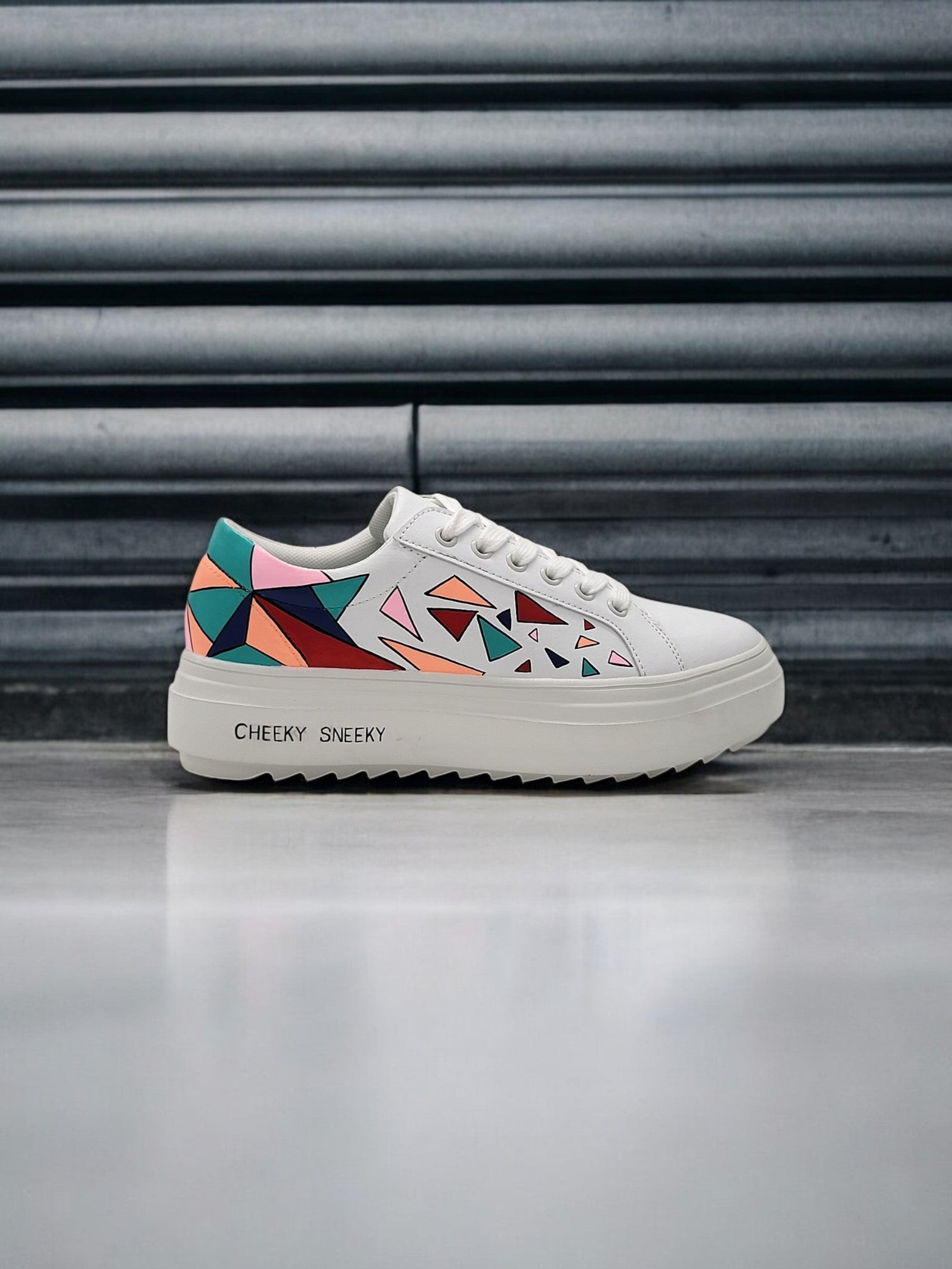 Transform your look with these dynamic and modern Shape Shifter sneakers! Featuring a clean white base adorned with a bold geometric design in vibrant colors, these shoes offer a unique and eye-catching style. The subtle "CHEEKY SNEEKY" detail adds a touch of playful personality.